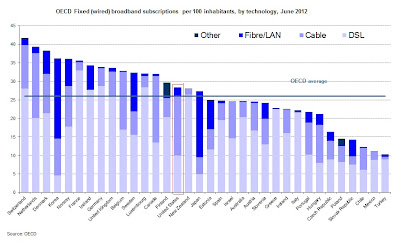 The US is slightly above average on all broadband, but when it comes to a high fibre-optical diet (the dark blue part of the bars), we are ahead of several other countries that have greater total penetration. On the other hand, the Scandinavian countries are ahead of us, as are, impressively, the Asian countries.