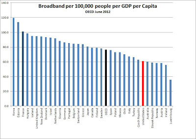 As of a year ago, France had greater broadband penetration despite a lower per capita GDP ($35,133 vs. $46,588) – 25% more broadband on 33% less income, and at half the cost to consumers. If you re-rank the OECD countries factoring in per capita GDP, the line-up changes. Wealthy countries – notably the US and Luxembourg, drop well below the OECD average.